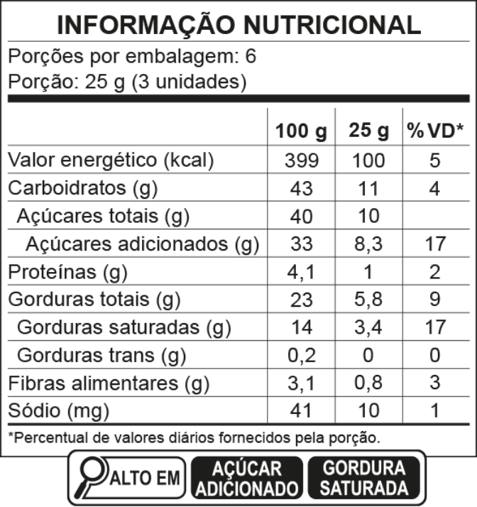 Ingredientes: Chocolate branco (açúcar, manteiga de cacau, leite desnatado em pó, gordura vegetal, leite em pó integral, soro de leite em pó, gordura anidra de leite, emulsificantes lecitina de soja e poliglicerol polirricinoelato e aromatizante), chocolate meio amargo 40% cacau (açúcar, massa de cacau, manteiga de cacau, gordura vegetal, gordura anidra de leite, emulsificantes lecitina de soja e poliglicerol polirricinoleato e aromatizante) e framboesa.
