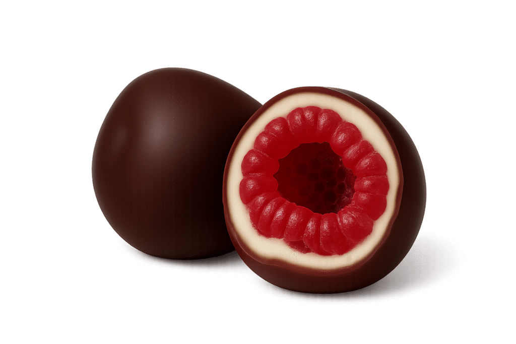 Framboesas envolvidas em camadas de chocolate branco e chocolate meio amargo.